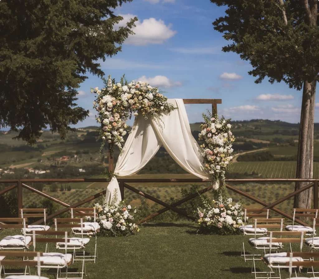 If you want to organize the perfect wedding without stress, you can rely on Borgo Divino's team for wedding planning, with both in-person and online meetings. We take care of every detail, from décor and menu selection to location, guest activities, and more. We provide you with our trusted suppliers, such as photographers, florists, DJs, and more. And, if you wish, we can add delightful extras like an ice cream cart or a midnight snack with croissants and cappuccino. Whether you're near or far, organizing a fairytale wedding in Tuscany has never been easier.