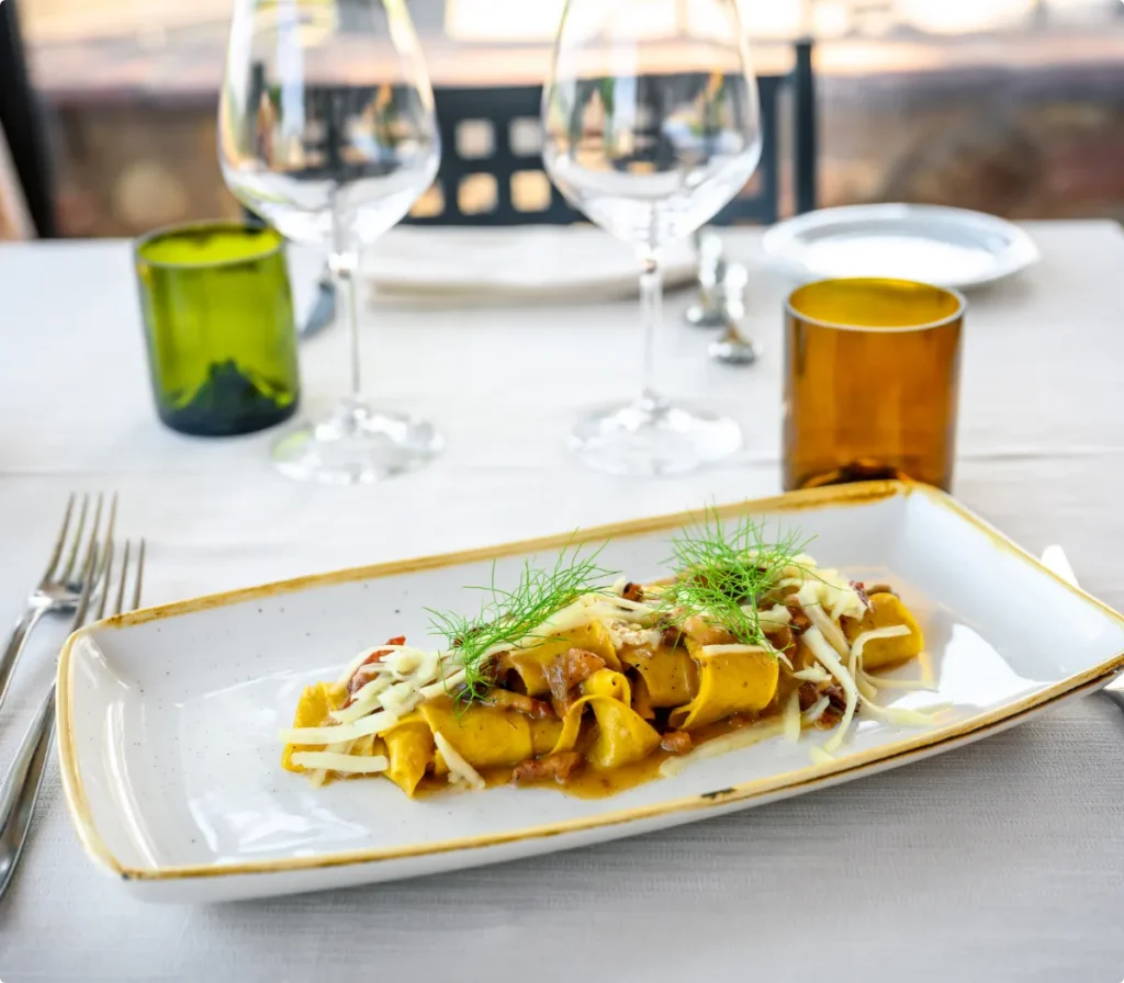 Carne alla brace, pasta fatta in casa, tartufo e verdure di stagione formano un menù tipico toscano che si abbina ai vini corposi del Chianti. Se è vero che gli ingredienti sono l’alfabeto della cucina, allora nel ristorante di Borgo Divino componiamo autentiche poesie toscane.